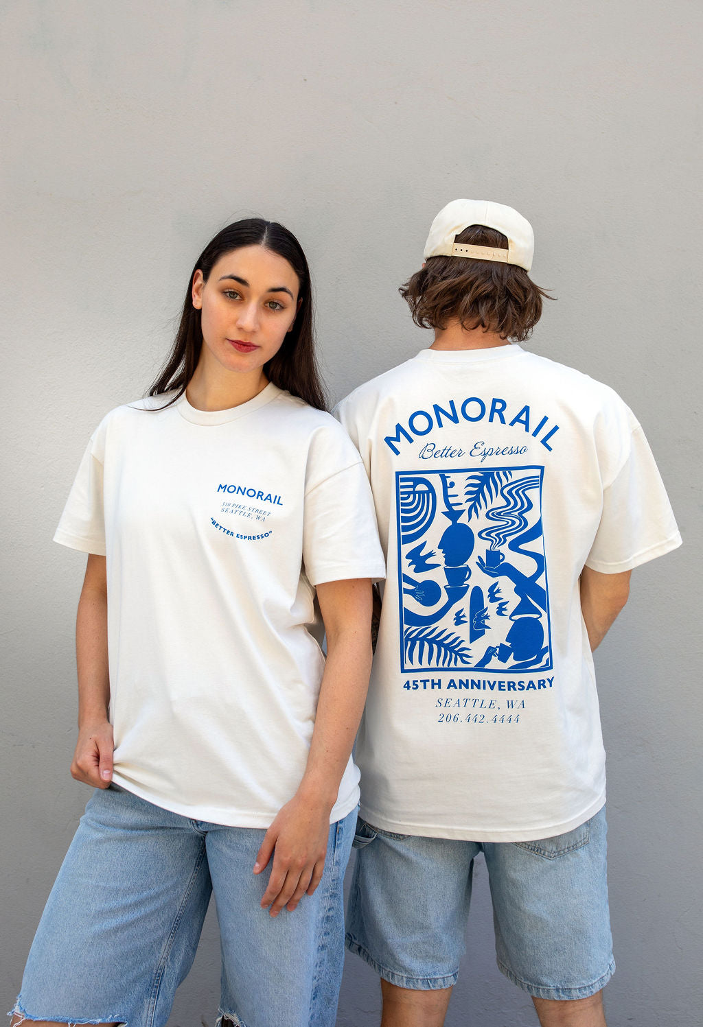 Commemorate Monorail’s 45th Anniversary with this oversized T-shirt in Bone, pairs heavy weight cotton jersey with a chest and back screen print, she delivers modern comfort along with local artwork by Jen Ament.